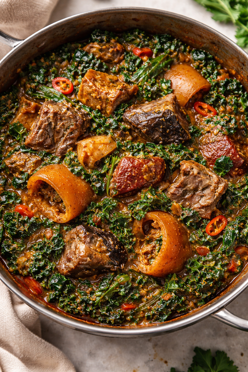 A rich Nigerian vegetable soup (Eforiro) cooked with cow stomach (shaki) and cow skin (pomo), served with a smooth semolina wrap. Deeply flavorful and filling — a true Nigerian classic.